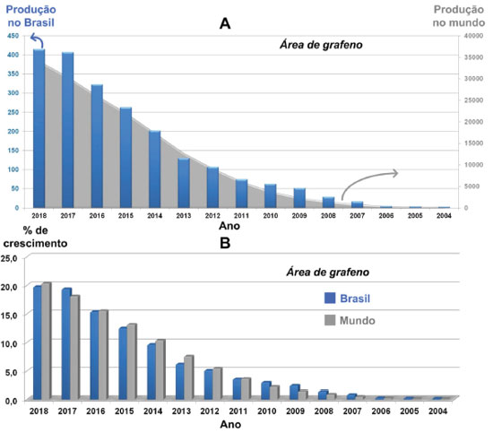 No cenário da pesquisa na área de grafeno, que surgiu muito mais recentemente, a participação do Brasil nas publicações também é notória. Segundo o "Web of Science" (pesquisa de tópico com "graphene"), no período entre 2004-2018 tem-se 166806 publicações no mundo todo. O Brasil contribui com 1,25% na produção mundial, tendo 2103 publicações entre 2001-2018 (entre 2004-2018 tem-se 2095 artigos). Em 2013, a produção do Brasil nessa área em relação ao mundo era de 1,23%.1 A Figura 3A apresenta a distribuição de publicações por ano no Brasil, comparado com o mundo. Mostra um crescimento mais acentuado comparado com os dados envolvendo nanotubos de carbono, decorrente claramente da sua mais recente descoberta. A Figura 3B ilustra o crescimento percentual nas publicações na área de grafeno no Brasil e no mundo, evidenciando um perfil maior de crescimento comparado com o perfil observado com nanotubos de carbono. Por exemplo, com nanotubos de carbono, o crescimento passou pouco acima de 10% ao ano. Já na área de grafeno, tem-se um crescimento que chega a 20%. Ainda, observa-se que o crescimento na produção brasileira com grafeno está mais equiparada com o resto do mundo, quando comparada com a temática de nanotubo de carbono.