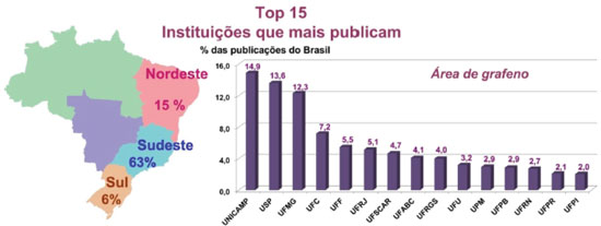 ![]() Figura 4. As 15 instituições e sua distribuição por região, que mais publicam na área de grafeno no Brasil entre 1993-2018 segundo o "Web of Science" (Julho/2019)