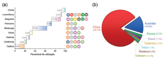 ![]() Figura 1. (a) Algumas das principais aplicações das TR, com seus respectivos percentuais de utilização (em termos do volume total) e (b) percentuais de produção de TR por diferentes países30,31