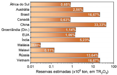 ![]() Figura 2. Estimativas das principais reservas de TR (em termos de óxidos) ao redor do mundo e respectivas percentagens em termos do total mundial (132.000.000 ton)31