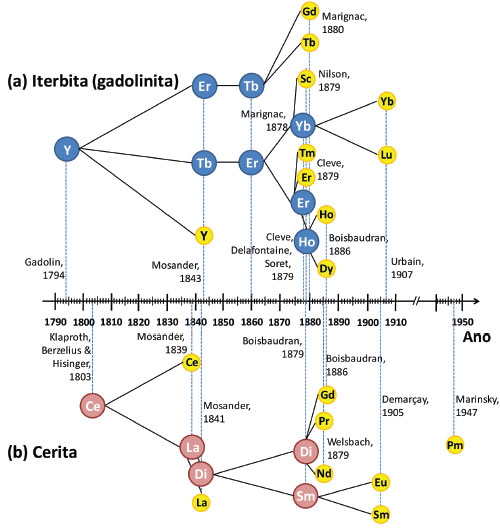 ![]() Figura 3. Cronologia histórica do descobrimento das TR: (a) das terras ítricas a partir da iterbita (gadolinita) e (b) das terras céricas a partir da cerita. (Reproduzido da Ref. 9)