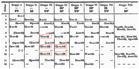 ![]() Figura 4. Versão da Tabela Periódica de Mendeleev publicada no Liebigs Ann. Chem. em 1871,40 com destaque para as TR conhecidas à época (Yt=ítrio; Di=didímio; Er=érbio; Ce=cério; e La=lantânio)