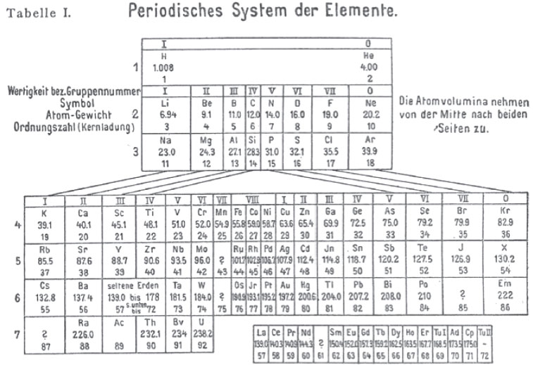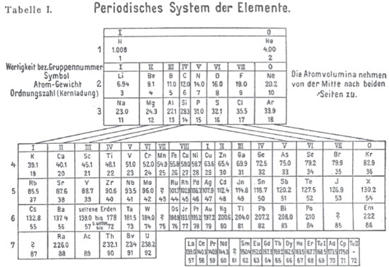 ![]() Figura 5. Tabela Periódica proposta por Stefan Meyer, publicada no Physikalische Zeitschrift em 1918,11,42 com a acomodação das TR como um grupo intraperiódico
