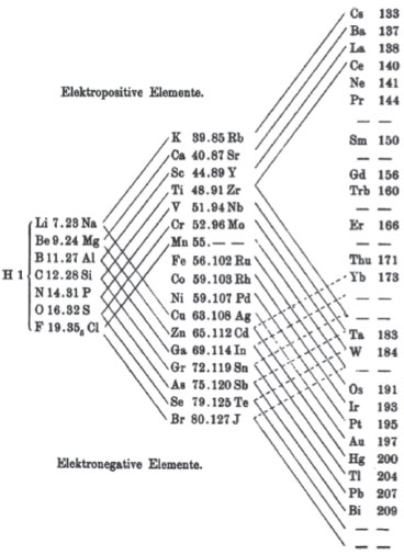 Ao início do século XX, somente Sc, Y, La e Ce tinham sido acomodados com clareza nas Tabelas Periódicas. O elemento seguinte (Di, posteriormente Pr e Nd) não apresentava comportamento pentavalente como sua posição em princípio indicava. À época, por exemplo, já se sugeria que os elementos do chamado "grupo do cério" (i.e., as TR) também poderiam apresentar comportamentos parecidos entre si, tais como nas tríades Fe/Ni/Co, Pd/Rh/Ru e Pt/Ir/Os, que possuem peso atômico praticamente constante e possuem química relativamente similar (sendo posicionados nos mesmos grupos nas tabelas de Mendeleev) (Figura 4). No entanto, a não acomodação das TR no sistema periódico nascente e as inversões necessárias na ordem de peso atômico para alocar alguns elementos junto aos seus similares (e.g. Ar e K, Co e Ni, e Te e I) passaram a colocar em dúvida a lei periódica de Mendeleev. Frente a essas dificuldades, várias teorias foram progressivamente propostas. Por exemplo, William Crookes, especialista em espectroscopia atômica e um dos inventores dos tubos a vácuo, propôs o conceito de meta-elementos para explicar o comportamento das TR.41 Segundo esse conceito, os elementos químicos seriam combinações de diferentes meta-elementos, caracterizados por pequenas variações no seu peso atômico, sendo que o peso atômico de um elemento seria a média dos pesos atômicos de seus meta-elementos componentes. Embora essa teoria possa ser considerada como um embrião do conceito atual de isótopos, o conceito de meta-elementos de Crookes provou-se errado através de estudos de espectros atômicos realizados por Georges Urbain. Posteriormente, os químicos passaram a utilizar o conceito de grupos intraperiódicos para acomodar alguns elementos nas tabelas periódicas da época. Nesse caso, agrupavam-se coletivamente diferentes elementos em grupos intermediários aos grupos de comportamento bem definido, tal como nas tabelas de Jan Willem Retgers (1895) e Bohuslav Brauner (1902). Uma das mais famosas disposições com grupos intraperiódicos é a de Stefan Meyer (que não possui relação com Lothar Meyer),42 em que as TR (Seltene Erden em alemão, referindo-se na verdade aos lantanídeos) são posicionadas como um grupo intermediário abaixo de Y e Zr (Figura 5). Além disso, note-se nessa tabela os nomes Ad (aldebarânio) e Cp (cassiopeio) no lugar de itérbio (Yb) e lutécio (Lu), ilustrando a disputa pelos nomes desses dois elementos entre os descobridores da escola alemã (a de Meyer) frente aos nomes sugeridos pelos descobridores da escola francesa (de Marignac e Urbain).