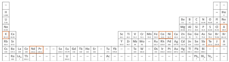 ![]() Figura 7. Reprodução do arranjo proposto por Alfred Werner em 1905 (ocupando a página 916 do volume 38 do Chemische Berichte em 1905),47 em que se propõe uma organização similar à atual (com os lantanídeos como um intergrupo) em disposição alongada. Os elementos circulados destacam as inversões de ordem de peso atômico (Ar/K, Co/Ni, Te/I e, na proposição de Werner, Nd e Pr)