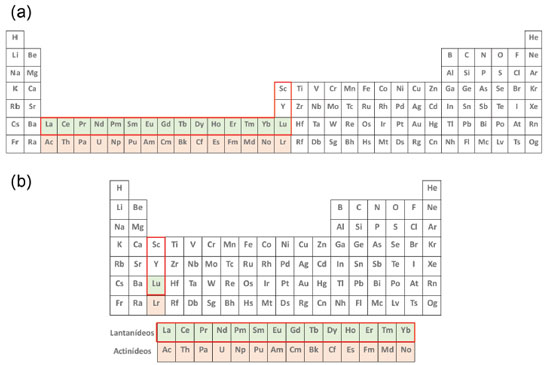 ![]() Figura 9. Arranjo atual da Tabela Periódica (com destaque em vermelho para as TR), com a disposição sugerida para os lantanídeos (verde) e actinídeos (laranja) em formato (a) alongado (posicionando o bloco f como um intergrupo) e (b) condensado (representando o Grupo 3 como Sc-Y-Lu-Lr e com os elementos do bloco f em separado)