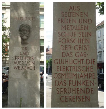 ![]() Figura 10. Busto em homenagem a Carl Auer von Welsbach nas proximidades do Instituto de Química da Universidade de Viena (Áustria), em virtude de suas contribuições à iluminação através "de pesquisas com cério e metais para a criação de lâmpadas a gás, lâmpadas elétricas de ósmio e do mischmetal utilizado em pedras para isqueiros"