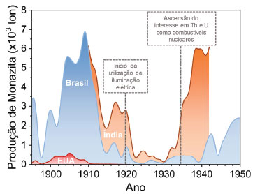 ![]() Figura 11. Evolução da produção de monazita entre o fim do século XIX e a primeira metade do século XX, ilustrando as frações correspondentes à contribuição de Brasil, EUA e Índia (construído a partir de dados da literatura)63