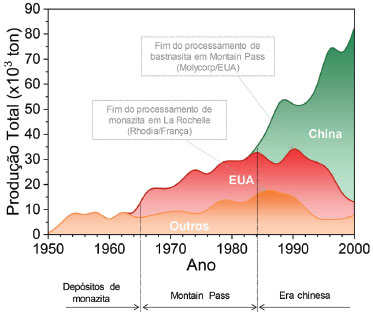 ![]() Figura 12. Evolução da produção mundial de TR (em toneladas de óxidos) durante a segunda metade do século XX e participação relativa de seus principais fornecedores. (Adaptado da literatura)64