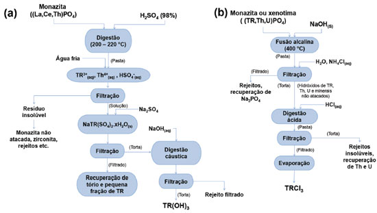 ![]() Figura 13. Esquematização das metodologias de processamento da monazita e xenotima através (a) de abertura ácida por ataque com ácido sulfúrico e (b) abertura alcalina utilizando-se soda cáustica (Reproduzido da Ref. 1)