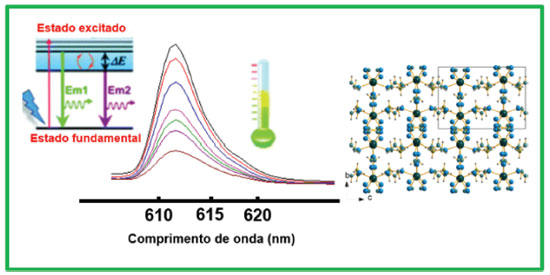 Mais e mais atenção tem sido dada ao design e síntese LOFs. Suas propriedades físico-químicas estão sendo investigadas profundamente, especialmente suas propriedades luminescentes. Os íons lantanídeos possuem vários níveis de energia oriundos das transições do tipo f-f, o que pode produzir emissões que se expandem do ultravioleta (UV) ao visível (VIS) e infravermelho próximo (NIR). Complexos luminescentes exibem características únicas, como bandas de emissão estreitas oriundas das transições eletrônicas 4f, grandes separações entre máximos de excitação e de emissão (deslocamento pseudo-Stokes >200 nm) e longo tempo de vida de estado excitado, pouco afetados pelo ambiente químico. Sensores luminescentes usando LOFs representam um método simples, eficaz e confiável para reconhecer espécies.151 O procedimento conhecido como modificação pós-sintética (PSM) oferece uma oportunidade para alterar e expandir suas propriedades.152 Com relação ao sensoriamento luminescente, a temperatura é um parâmetro termodinâmico fundamental, cuja medida é de interesse crucial em diversas investigações científicas e de desenvolvimento tecnológico. Em contraste com os sensores convencionais de temperatura (como termômetros de contato), o método baseado em luminescência é uma alternativa não-invasiva e com alta acurácia, devido sua rápida habilidade de resposta, alta resolução e alta resistência a campo magnético ou elétrico. Uma série de exemplos foram reportados por Chen, Cui et al., com misturas de lantanídeos, demonstrando comportamento especial de dependência entre temperatura e luminescência e suas potencias aplicações em termômetros luminescentes (Figura 16).153 Um dos primeiros MOFs luminescentes sintetizados e utilizados como sensores termométricos foram as LOFs [Tb2(DMBDC)3]n e [Eu2(DMBDC)3]n, em que DMBDC representa o ligante 2,5 dimetoxi-1,4-benzenodicarboxilato. Ambos exibiram luminescência característica quando excitados em 381 nm, atribuída à transição eletrônica π*←π do ligante, indicando que o ligante é um forte sensibilizador (cromóforo antena). Com o aumento de temperatura de 10 a 300 K, a intensidade de luminescência de ambos MOFs, Tb3+ e Eu3+, diminui gradativamente devido à ativação térmica dos decaimentos não-radiativos. Diferentemente das LOFs que contém apenas um tipo de lantanídeo, nas redes mistas (Tb3+0.9931Eu3+0.0069‑DMBDC), o composto exibe uma interessante dependência entre luminescência e temperatura. A intensidade de emissão dos íons Tb3+ diminui, enquanto, para os íons Eu3+, aumenta com a temperatura. A diferente relação de dependência entre temperatura e o metal central na emissão, em um único composto, permite que o material seja um candidato ideal como referência em termômetros luminescentes, como virtualmente nenhuma calibração adicional de intensidade de luminescência é necessária. Nesse sentido, o campo da nanotermometria óptica utilizando a luminescência de íons lantanídeos é um campo em crescente ascensão, não apenas com a utilização de LOFs, mas também de nanopartículas sólidas e coloidais, com uma imensa gama de aplicações para o sensoriamento térmico em nanoescala.154-158