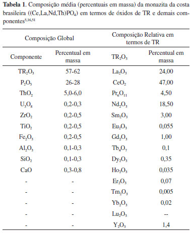 PRIMÓRDIOS DA EXPLORAÇÃO DAS TERRAS RARS NO BRASIL O Brasil dispõe diferentes tipos de depósitos de TR, estimadas em um total de aproximadamente 22.000.000 ton,31 embora grande parte desse volume corresponda a minerais de processamento não estabelecido ou consideravelmente complexo. Tais reservas compreendem minerais alcalinos intrusivos, carbonatitos, depósitos lateríticos, fluviais e costeiros.1,2,4,16 Dos minerais de TR presentes no Brasil, o que apresenta a maior facilidade de prospecção e processamento é a monazita, estando a ela relacionados os primórdios da exploração de TR no país. A monazita é um ortofosfato das terras céricas e de tório, ocorrendo nos mais diversos ambientes geológicos como mineral acessório em rochas ígneas, metamórficas ou na forma de areias.16,50 Trata-se de um mineral relativamente denso (4,6-5,4 g cm-3), de lustro resinoso e com dureza variável entre 5,0 e 5,5 na escala de Mohs. O termo monazita tem origem no grego "monazeis", que significa "estar só", pois seus cristais normalmente ocorrem isolados em rochas ígneas pegmatitas. O conteúdo total de TR, bem como a distribuição das TR particulares e a quantidade de tório, depende de sua localização específica. Contudo, a monazita geralmente é composta de 70% em massa de óxidos de TR, sendo ~40-50% CeO2, 20-30% La2O3, além de quantidades variáveis de traços (<0,2%) a até ~5% de Y2O3. A Tabela 1 mostra a composição média da monazita brasileira, que ocorre predominantemente na forma de areias, contendo quantidades variáveis de minerais acessórios como rutilo (TiO2), ilmenita ((Fe,Mn,Mg)TiO3) e zirconita ((Zr,TR)SiO4). Como mostram os dados, o tório ocorre em porcentagens de 5%, sendo que quantidades nem sempre pequenas de urânio também são presentes.
