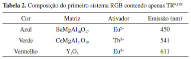 APLICAÇÕES Materiais constituídos de TR são cruciais em muitas tecnologias modernas, como smartphones, televisores e monitores, discos rígidos, veículos híbridos e elétricos e muitos outros. A indústria de TR beneficia a economia em todo o mundo com sua extensa cadeia de fornecimento e aplicações. Suas propriedades magnéticas,2,3 catalíticas,27-29,75,76 e ópticas77 as tornam aplicáveis em diferentes e variados campos.78-80 Em particular, suas propriedades luminescentes, conferidas pelas intensas e estreitas bandas de emissão, resultantes de transições do tipo f-f, geram cores específicas em dispositivos luminescentes.81,82 Assim, materiais luminescentes contendo terras raras possuem extensa aplicação em dispositivos de iluminação, como displays emissores e lâmpadas fluorescentes,83,84 sendo extensamente processados na forma de luminóforos de estado sólido,85-99 materiais híbridos e compostos de coordenação,100-108 vidros,109-114 híbridos magnéticos-luminescentes,115,116 entre muitos outros. Além disso, a utilização de ferramentas teóricas para a descrição da luminescência de lantanídeos é extremamente útil para o aprimoramento e adaptação das propriedades observadas.117-121 O número crescente de aplicações industriais com elementos de terras raras despertou o interesse em novas tecnologias de extração via fontes alternativas.122-128 Embora as propriedades luminescentes dos compostos de TR fossem conhecidas desde o final do século XIX e início do século XIX, o primeiro composto usado contendo terras raras foi o vanadato de ítrio dopado com európio(III), emissor vermelho.9 No final da década de 1960, os fosfatos de estrôncio dopados com Eu2+ eram utilizados como emissores azuis. Os emissores verdes que utilizavam o íon térbio(III) surgiram na década de 1970, quando a Philips introduziu o primeiro sistema baseados nas três cores primárias, vermelho, verde e azul (RGB), contendo apenas compostos de TR, conforme ilustrado na Tabela 2.9,129