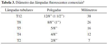 Os halofosfatos, usados nos sistemas de emissão de luz, se mostraram menos eficientes com o tempo, devido a tendência global em diminuir o diâmetro dos tubos das lâmpadas. Com isso, os halofosfatos começaram a ser abandonados e os compostos de TR passaram a ser mais utilizados, com introdução das lâmpadas fluorescentes compactas, no início da década de 90. As lâmpadas tubulares são denominadas T12, T8, T5, T4, T2, em função de seus diâmetros, conforme a Tabela 3. Os materiais fosfóricos de lâmpadas recicladas contêm quantidades significativas de alumina (Al2O3) e sílica (SiO2) que são usadas como camada de barreira. A camada de barreira está presente entre a camada que contém material fosfórico e o tubo de vidro. Sua função principal é proteger o invólucro de vidro contra o ataque de vapor de mercúrio e, assim, evitar a perda de mercúrio da lâmpada e a redução da saída de luminosidade da lâmpada. A camada de barreira também melhora a eficiência da lâmpada, refletindo a luz UV que passa através da camada de material fosfórico para a camada de , vidro.