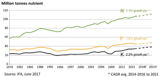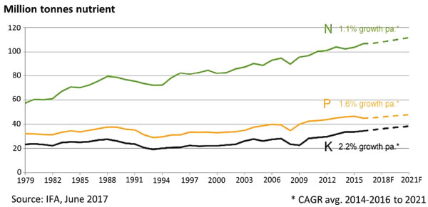 N, P AND K DEMAND, SUPPLY, SOURCES AND ENVIRONMENTAL IMPACTS Following the FAO Bulletin,23 the world consumption of the three main fertilizer nutrients, nitrogen (N), phosphorus expressed as phosphate (P2O5), and potassium expressed as potash (K2O), was estimated to reach 186.67 million tons (N, P2O5 and K2O) in 2016, up by 1.4 percent over 2015 consumption levels. The demand for N, P2O5, and K2O was forecast to grow annually on average by 1.5, 2.2, and 2.4 percent respectively from 2015 to 2020. In this period, the global capacity of the production of fertilizers, intermediates and raw materials was also expected to increase, and these projects have been verified so far, according to the most recent annual bulletins. The FAO Bulletins provides data on the global and regional fertilizer supply / demand balance. The global balance is the difference between supply and total demand (including fertilizer demand + nonfertilizer demand). Regional balance is a medium-term indicator of potential changes in fertilizer nutrient demand and supply in the region. The installed supply capacity, operating rates and demand variations are carefully followed by organisms concerned with food safety, because they can have a strong effect on global food prices and availability. Forecasts on the demand consider the cropped area and application rate of fertilizer, market feedback, estimates by industry associations, growth models, econometric models and expert advice. Other important factors are unforeseen: feedstock and/or raw material limitations, logistical problems, unscheduled shutdown in mining and transportation due to technical reasons, natural calamities (earthquake, mine flooding, etc.). These factors are not considered in the balance, but they may have an effect. Moreover, market turbulence may drive fertilizer price changes, as it was observed in the financial crisis in 2008. Shortly, the American real estate market had been growing steeply for a relatively long period but the basis for this growth was not solid. When this "bubble" burst, investors looked for other targets for their applications and found one in the global commodities market. Fertilizer, grain and other commodity steep price increases followed, triggering what was then called the "food crisis". Data from industry shows a steady growth in the production and use of fertilizers (Figure 1), for the past thirty years. Nearly half of the consumption is from N fertilizers, followed by P and K.
