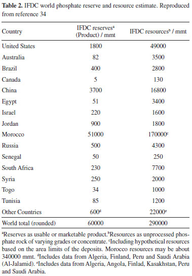 CURRENT RESERVES Nitrogen extraction from the air will likely continue to be unhindered, for centuries or millennia, provided the energy required to do N fixation through the Haber-Bosch process is available or alternative chemical or biological N fixation processes are discovered and developed. It is important to take into account the mechanisms implied in fertilizer nitrogen transformation and uptake by plants that are part of the global N cycle.33 K is also abundant: the global recoverable reserves warrant fertilizer production at the current rates for thousands of years, as presented in the Potassium section of this article. Beyond, there is plenty of this element in the seawater and in minerals that are not currently considered as economic sources of this element. However, the concentration of potassium ores in a few places in the world leads some countries with large agricultural production to depend on imports, as in the case of Brazil and China. On the other hand, P availability has been a matter of concern and the literature contains many references to its scarcity, in a near future. This is a matter of current debate, triggered by resource estimates published by IFDC34 that were criticized in the literature.35 The center of the criticism in the reported increase in global phosohate rock (PR) reverse, from 16 000 Mt in 2010 to 65 000 Mt in 2011 and further to 67 000 Mt PR in 2014. This 4-fold increase derives mainly from the increased Moroccan reserves, from 5700 Mt PR as reported by USGS, to 51 000 Mt PR, reported as "upgraded concentrate". The same report increased global resources from 163 000 Mt PR reported in the literature in 1989 to 290 000 Mt PR. Edixhoven et al. stated that the data on which the IFDC statements were based "do not appear to warrant such a conclusion. Further research is required as to the quantity of PR deposits and their viability for future extraction, using uniform and transparent classification terminology." However, the critics were also criticized36 by Scholz et al., who reached an estimated 57.5 Gt of phosphate rock reserves, not far from the IFDC 64 Gt estimate. The main issue is the assessment of Moroccan reserves that currently represent a sizable fraction of the global estimate. This dispute originates ultimately from differences in terminology and in methodology used by different authors. Since P fertilizers are currently consumed at the rate of ca. 0.05 Gt a year, reserves in the range of 60Gt can sustain the current exploitation rate for more than one-thousand years. It remains to be seen which fraction of these resources will be actually converted into reserves. On the other hand, there is a heavy concentration of the current reserves in Morocco (Table 2) that poses another problem to large P importers that is the dependence on a single supplier.