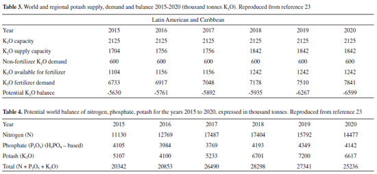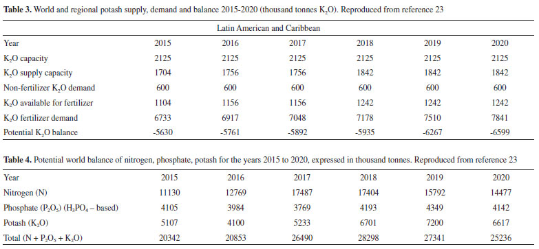BRAZILIAN DEPENDENCE ON IMPORTED SUPPLIES Brazil is strongly dependent on imported fertilizers, as well as Latin America and the Caribbean that show a negative demand/supply balance for N, P and K, shown in Figure 5. This country is the fourth main consumer of fertilizers in the world and nearly 74% are imported (N - 75%; P - 51%; K - 91%). From 2007 to 2017, the NPK imports increased by more than 100%, reaching USD 2.75 billion in 2017. The evolution of the K2O balance in Latin America, in the 2015-2020 period, is shown in Table 3: The production capacity is stagnant, and the actual supply capability increases less than the demand, leading to an expected negative balance in excess of 6.5 million tons, for the region. The situation is aggravated by estimated 50% losses of the nutrients used by farmers: highly soluble N and K compounds are leached by rain and P is sequestered in the iron (III) and aluminum-rich soils.