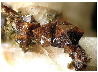![]() Figura 1. Cristais hexaocataédricos de pirocloro encontrados no monte Malosa, Zomba, República do Maláui. Fotografado por Christian Rewitzer8