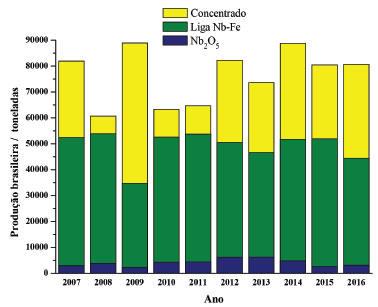 ![]() Figura 2. Produção brasileira anual de concentrado de minério (em termos de Nb2O5), ligas Nb-Fe e Nb2O5 comercial. Os dados foram obtidos dos dez mais recentes sumários minerais fornecidos pela Agência Nacional de Mineração10