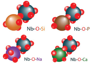 ![]() Figura 3. Algumas possibilidades da ligação de Nb em diferentes séries: Nb-O-Si; Nb-O-P; Nb-O-Na; Nb-O-Ca. A fórmula geral pode ser escrita como [Nb(OM)6-y(OSi)y], como 1≤y≤5 e M=Na, Ca ou P. Adaptado da referência 22