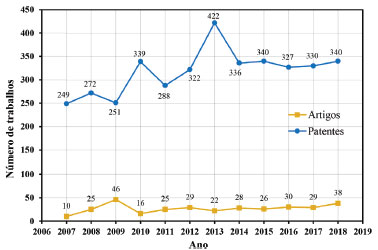 ![]() Figura 4. Patentes e artigos científicos gerados nos últimos doze anos sobre aplicações catalíticas de óxidos de nióbio. Os números foram obtidos do banco de dados SciVerse Scopus, pesquisando por "niobium oxide catalysis"43