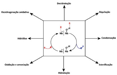 As vantagens dos óxidos de nióbio não se limitam ao uso exclusivo como fase ativa, quando pequenas porções de óxidos de nióbio são incorporadas à matriz de outros catalisadores, há um ganho na atividade e na seletividade das reações, além de aumentar a vida útil do catalisador.44 Como suporte, as espécies de Nb2O5 interagem muito bem com óxidos e metais de transição, produzindo catalisadores com propriedades únicas.39,40,44 Além disso, substituições isomórficas têm sido feitas em peneiras moleculares com o objetivo de aumentar disponibilidade os sítios ácidos de Lewis e Brönsted desses materiais.39 A Figura 5 mostra algumas das classes de reações em que os compostos contendo Nb são comumente utilizados.45