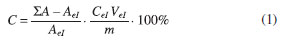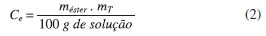 C é a conversao em % de éster, ΣA é a somatória das áreas integradas de todos os picos, AeI é a área do pico do padrao interno utilizado, neste caso o metil heptadecanoato, CeI é a concentraçao do padrao interno em mg/mL, VeI é o volume de padrao interno utilizado no preparo da amostra antes da injeçao em mL e m é a massa da amostra analisada em mg. A concentraçao em % de éster formado é dada em mg de éster por 100 mg de soluçao, e por meio de um balanço de massa é possível obter a massa de éster formada (Equaçao 2), em relaçao a massa total dos reagentes utilizados na reaçao.