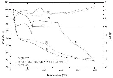 Figura 1. Curvas de análise térmica (TGA/DTA) do catalisador KISN9, sílica e PTA