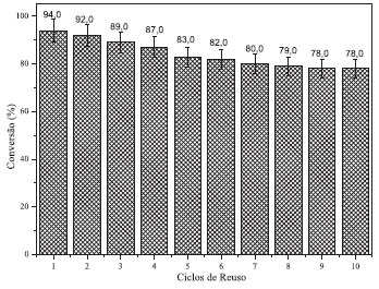 A sílica e o catalisador apresentam pelo menos três eventos térmicos na curva de DTA (em 55, 250 e 430 ºC), os dois primeiros sendo atribuídos respectivamente à perda de água fisiossorvida (4,0 % até 55 ºC) e desidroxilaçao da sílica polihidroxilada (0,5 % até 250 ºC). O terceiro evento na curva (2) a partir de 250 e 430 ºC e na curva (3) entre 250 e 345 ºC, com perda de 0,5 % para ambos, estao relacionadas à cristalizaçao da sílica. Esta diferença das temperaturas do terceiro evento é ocasionada devido à presença do PTA. A decomposiçao da sílica tem início na temperatura de 430 ºC, com perda de massa total da temperatura ambiente até 1000 ºC de 0,5 % para a curva (3) e entre 345 e 1000 ºC com perda de massa de 1 % para a curva (2).23 No catalisador KISN9 (Tabela 3), os eventos térmicos basicamente consistem de uma superposiçao dos eventos da sílica e PTA, embora alguns picos tenham sido deslocados para menores temperaturas devido ao tamanho de partículas do PTA nos poros/superfície da sílica. Estabilidade química e recuperaçao dos catalisadores Os teores de PTA lixiviado no meio reacional, acompanhados por UV-VIS, sao mostrados na Tabela 3. Os resultados apresentaram menores teores de lixiviaçao (erro menor que 10-3) quando preparados com o acetonitrila e o HCl 0,1 mol L-1, com destaque para os catalisadores preparados com 0,5 g de PTA e HCl 0,1 mol L-1. Esses resultados indicam maior estabilidade do catalisador, visto que foram calcinados em temperaturas de 200 ºC, em contraste ao trabalho anterior, nos quais os materiais foram calcinados à 530 ºC.15 O meio ácido (HCl 0,1 mol L-1) propiciou um aumento na acidez do meio reacional, favorecendo a impregnaçao e evitando a hidrólise do ânion Keggin durante a evaporaçao do solvente.24 Para confirmar estes resultados outro método (qualitativo) foi empregado para avaliar-se a lixiviaçao, que foi a titulaçao da soluçao sobrenadante do meio reacional com um agente redutor (soluçao de ácido ascórbico a 10 %), a qual reagiria com o íon Keggin formando um complexo de coloraçao azul. Como nao houve o surgimento da coloraçao azul em nenhum dos ensaios, esta é evidência direta de que o catalisador é estável nas condiçoes reacionais empregadas. 25 Avaliaçao da atividade catalítica (TON e TOF) Testes de reuso do catalisador foram efetuados somente para as condiçoes otimizadas de preparo, cujo solvente empregado na impregnaçao foi o HCl 0,1 mol L-1. O HCl provavelmente conferiu um aumento da acidez de Brönsted ao material, favorecendo uma maior concentraçao de sítios ácidos e tornando-o mais ativo para a reaçao de esterificaçao.26 O catalisador perde aproximadamente 16 pontos percentuais de atividade catalítica após os 10 ciclos de uso (diferença das conversoes do primeiro (94 %) e do décimo ciclo (78 %) (Figura 2). A explicaçao pra esse fato se deve a quatro fatores principais: 1: Nem todo o catalisador foi recuperado em cada ciclo de reuso fazendo com que as massas dos reagentes tivessem que ser ajustadas à nova realidade para manter as razoes molares e teor do catalisador constante. Esse efeito causa um vazio no topo do reator que pode conter vapor de metanol, ocasionando uma menor razao molar álcool:ácido graxo, diminuindo a conversao. 2: Após sucessivos ciclos de reuso, a lixiviaçao nao detectada em um ciclo de uso pode se manifestar. 3: Desativaçao por outros efeitos como a obstruçao dos poros pelos reagentes e produtos, agregaçao dos cristais de PTA o que ocasiona diminuiçao da área superficial, desativaçao térmica, etc.27