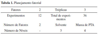 PARTE EXPERIMENTAL Planejamento experimental da impregnaçao do PTA em sílica com diferentes solventes O preparo do catalisador foi realizado por impregnaçao com excesso de soluçao,18 como descrito anteriormente.15 Utilizou uma sílica SI-1452 (Grace Davison) como suporte para a impregnaçao do ácido 12-tungstofosfórico - PTA (Vetec), o qual foi dissolvido em uma soluçao 1:1 de metanol (99,8 % - F. Maia) e água destilada, acetonitrila (99,5 % - Synth) e uma soluçao aquosa 0,1 mol L-1 de HCl (37 % P.A. - Merck). Esta sílica apresenta um tamanho médio das partículas de 2,10 mm, com uma área superficial de 375 m2 g-1, diâmetro médio de poros de 11 nm e um volume de poros de 1,01 cm3 g-1. Todos os reagentes, exceto os solventes, foram submetidos a uma pré-secagem, sendo a sílica a 600 ºC por 4 h e o PTA a 100 ºC por 6 h. As condiçoes de impregnaçao foram realizadas por meio de planejamento fatorial do tipo 22 (2 fatores, 3 níveis para o solvente e 4 níveis para a massa de PTA) e o volume de solvente fixado em 20 mL conforme mostra a Tabela 1.19 Utilizou-se o software MINITAB 14 nesta etapa do trabalho.