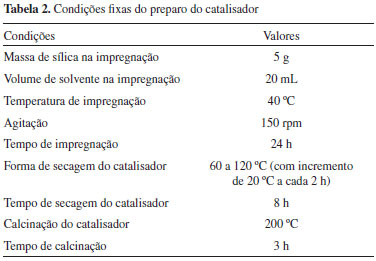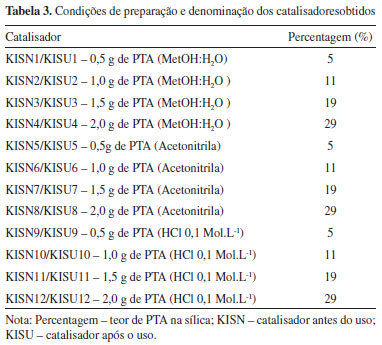 As variáveis selecionadas para a etapa de impregnaçao utilizando o planejamento fatorial foram a massa de PTA (variando entre 5, 11, 19 e 29 % de PTA), e o tipo de solvente, sendo utilizados MetOH:H2O (1:1 em volume), acetonitrila e uma soluçao aquosa de HCl 0,1 mol L-1. As condiçoes do preparo do catalisador estao apresentadas na Tabela 2 e os catalisadores obtidos, na Tabela 3.