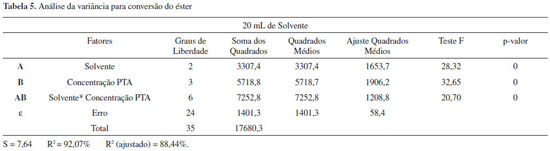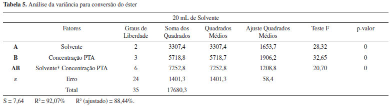 Contudo, as conversoes com os demais solventes também foram altas, em torno de 70 %. É importante ressaltar que os catalisadores preparados com o solvente HCl 0,1 mol L-1 (KISN9 à KISN12) também resultaram em conversoes expressivas, com uma media de 70 %. Sabe-se que o HCl 0,1 mol L-1 é muito menos tóxico do que os demais solventes, além do custo que também é muito menor. Esta análise é primordial sob a ótica da sustentabilidade, aliado ao custo operacional, uma vez que reduzindo o volume e a toxidade das matérias primas envolvidas nas reaçoes aliam-se características amigáveis ao produto final. A análise de variância (ANOVA) aplicada aos dados experimentais do planejamento fatorial resultou nos dados da Tabela 4. O ajuste para os dados analisados pode ser considerado muito bom para os dois solventes, pois R2 foi igual a 92,07 % e R2 ajustado em 88,44 %. Como o valor do R2 representa a fraçao da variaçao que é explicada pelo ajuste do modelo, quanto mais próximo de 100 % o valor do coeficiente R estiver, melhor estará o este ajuste às respostas observadas. Neste caso, o grau foi de 92,07 %, sobrando apenas 7,64 % de variabilidade por conta dos resíduos, os quais representam os dados que nao foram explicados pela ANOVA, podendo ser os erros aleatórios, devido ao grande número de variáveis envolvidas. Para testar a hipótese H0, utiliza-se o teste F apresentado na Tabela 5, no qual se verifica que o valor de p < 0,05, rejeita-se a hipótese nula e considera-se que há diferenças significativas entre os níveis para a resposta, que é a conversao em éster. Outro parâmetro importante é que o valor de F teórico, obtido na tabela de Fisher Snedecor com confiabilidade de 95 % foi de 3,27. Dessa forma, analisando-se o valor de F calculado na Tabela 5, observa-se que este é maior que o valor de F teórico, o que significa que a hipótese é aceitável.19