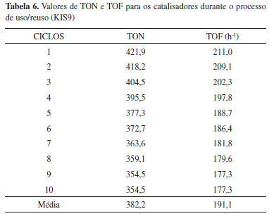 O número de turnover para o uso de 10 % de catalisador na reaçao com razao molar de 8:1 (MetOH:Acido Esteárico), na temperatura de 100 ºC foi calculado, resultando em um valor de 421,9 mols de substrato convertido por mol de PTA e um valor de TOF de 210,9 h-1. Tais valores mostram que, as altas conversoes catalíticas sao obtidas devido à alta eficiência por sítio catalítico ativo. Isto justifica a alta conversao após diversas regeneraçoes deste catalisador do meio reacional como apresentados na Figura 2. O fenômeno de desativaçao geralmente é atribuído à obstruçao dos poros do catalisador devido aos produtos de reaçao e à formaçao do coque durante o processo de calcinaçao do catalisador.27 Os valores de TON e TOF (Tabela 6) mostram que altas conversoes sao obtidas devido à alta eficiência dos sítios ativos do catalisador (esse valores sao certamente subestimados, já que certamente nem todos os sítios catalíticos do catalisador estao disponíveis). Destaca-se que a conversao, mesmo após 10 ciclos de reuso, é ainda alta (78%), e o catalisador mantêm cerca de 83 % da sua atividade catalítica original (78 %/94 %).