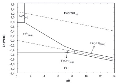 O ferro, no ambiente aquoso e oxigenado - como é o caso da crosta terrestre - apresenta uma química rica, em que intrincados processos podem ocorrer e deslocar o equilíbrio químico, de forma a solubilizar e ressolubilizar materiais, promover reações e transportar elétrons por meio de reações de oxirredução. A Figura 2 apresenta o diagrama Eh x pH (diagrama de Pourbaix) para o ferro, em condição de metaestabilidade. As fases mais estáveis termodinamicamente, como hematita, α-Fe2O3, e magnetita, Fe3O4, foram retiradas do diagrama. Observa-se que o Fe2+ é predominante em ambiente anóxico e pH ácido a circum-neutro. Em pH mais alto, observa-se a formação de FeOH+ e Fe(OH)2(s). Em ambiente aerado e pH baixo, o Fe3+(aq) é predominante. Os oxi-hidróxidos de ferro amorfos ou cristalinos, nesse último caso como a goethita, α-FeOOH, ou hematita, são formados em pH mais alto e em ambientes aerados. A magnetita, constituída de formas de ferro di- e trivalente, é formada em condições de Eh intermediário. No processo de desidratação, a goethita se transforma em hematita. A água e a presença de oxigênio modulam a distribuição das várias espécies químicas de ferro e, consequentemente, o seu comportamento químico na natureza.4