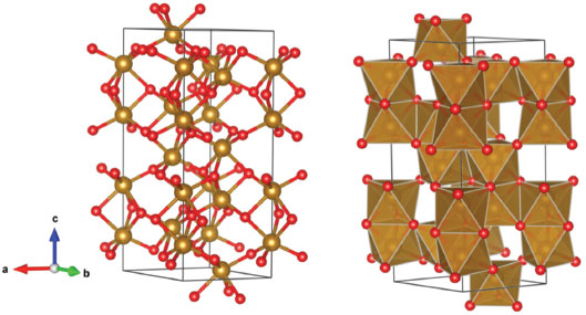![]() Figura 3. Estrutura da hematita. Ferro está com a cor marrom e o oxigênio de vermelho