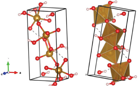 ![]() Figura 4. Estrutura da goethita. O ferro está com a cor marrom e o oxigênio de vermelho
