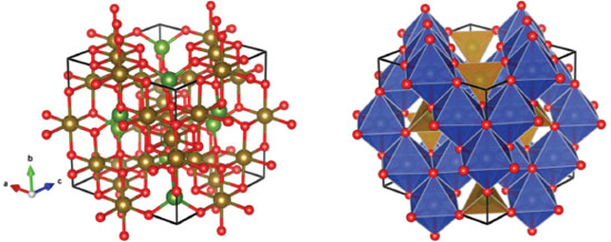 ![]() Figura 5. Estrutura da magnetita. Sítios de ferro tetraédricos estão em verde, octaédricos em marrom. O ferro está com a cor marrom e o oxigênio de vermelho