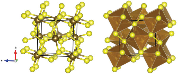Pirita - FeS2 A pirita, FeS2, é o mineral mais importante da classe dos sulfetos. Não é encontrado no minério de ferro. A pirita é uma preocupação ambiental principalmente nas regiões de mineração de ouro, urânio, cobre, entre outros metais nobres. O mineral é conhecido como "ouro dos tolos", devido a sua cor amarela metálica; cristaliza no sistema cúbico de face centrada, pertence ao grupo espacial Pa3 (#205)20 e tem parâmetro de rede a = 5,418 Å.21 Na célula unitária, encontram-se quatro unidades de FeS2 (Figura 6). Sua estrutura pode ser melhor compreendida comparando-se seu empacotamento cristalino com o do NaCl. A partir da estrutura iônica do NaCl, trocando-se os íons Na+ por Fe2+, e cada um dos ânions Cl- por S22-, é possível representar o arranjo cristalino da pirita. Na estrutura da pirita todos os átomos de ferro estão ligados a seis átomos de enxofre formando um arranjo octaédrico. Cada átomo de enxofre está ligado a três átomos de ferro e um átomo de enxofre, formando sítios tetraédricos. A pirita possui apenas duas ligações distintas: Fe-S e S-S. As ligações Fe-S são, por simetria, equivalentes e, da mesma forma, as ligações S-S dos dímeros S22-.