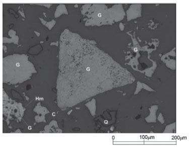 ![]() Figura 7. Fotomicrografia de uma amostra de minério de ferro. G - goethita, C - caulinita, Q - quartzo, Hm - hematita. Reproduzido com permissão da Ref. 24