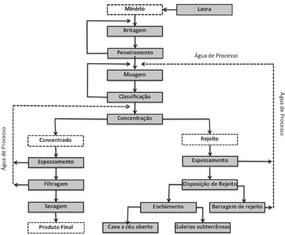 A rocha é composta de diferentes minerais (Figura 7). O processo de cominuição (britagem e moagem) irá reduzir o tamanho dos sólidos que vêm das minas, até o correspondente à etapa seguinte de concentração. Nessa etapa, é feita a separação das partículas do mineral de interesse utilizando-se alguma propriedade que as distingam dos minerais de ganga. Por exemplo, a diferença de densidade pode ser utilizada em processos gravíticos. As propriedades das superfícies dos minerais podem ser ajustadas pela adição de reagentes, para permitir a separação via flotação. Propriedades magnéticas podem ser também utilizadas para separar os diferentes minerais. Todos estes processos são dimensionados para se trabalhar com milhões de toneladas/ano e requerem espaço e disponibilidade de água. Em geral, parte da água proveniente do rebaixamento do lençol freático durante aprofundamento da cava da mina é utilizada na usina de beneficiamento. Ao final, é preciso recuperar a água utilizada, para ser reaproveitada no processo, minimizando o consumo de água nova. A diminuição do conteúdo de água nos rejeitos é importante para diminuir o consumo da água na usina e assim contribuir para a disponibilidade hídrica na região, mas também para aumentar a segurança das barragens de rejeito. A disposição a seco de resíduos é uma tendência crescente no beneficiamento dos minérios.