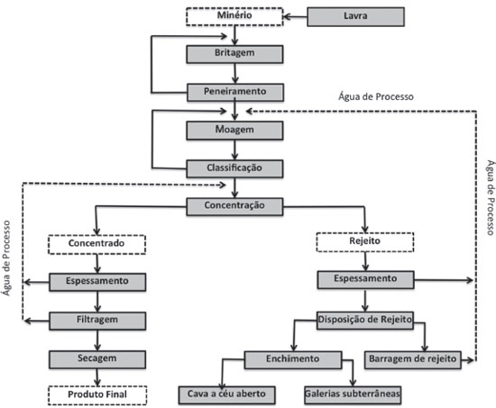 A Figura 8 representa um diagrama típico de tratamento de minério. O processo envolve operações unitárias clássicas25 que podem ser classificadas da seguinte forma:
