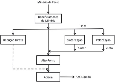 ![]() Figura 10. Processamento básico do minério de ferro para a fabricação de aço líquido