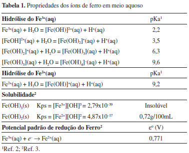 O ferro é um elemento ubíquo na crosta terrestre. Pode ser encontrado em grandes jazidas, na forma de minerais com teores extremamente variáveis mesmo como elemento traço. O ferro apresenta propriedades químicas e físicas que o faz importante em processos químicos e físicos, no ambiente mineral e nos sistemas biológicos. O elemento ferro apresenta configuração eletrônica [Ar]4s2 3d6 e dois números de oxidação (NOx) mais comuns, 2+ e 3+, com as configurações eletrônicas [Ar] 3d6 e [Ar]3d5, respectivamente. O raio iônico varia entre 0,63-0,78 Å, conforme a simetria do campo cristalino. A presença de orbitais "d" parcialmente preenchidos permite uma variação grande da energia de estabilização do campo cristalino, em função do NOx, dos ligantes ao redor do centro metálico e do número de coordenação. Para se compreender melhor a importância do ferro e da sua capacidade de modular vários processos químicos, biológicos e geoquímicos, é preciso analisar a sua reatividade em meio aquoso. A Tabela 1 mostra algumas das propriedades dos íons de ferro em meio aquoso. O Fe3+ é um ácido relativamente forte com pKas 2,2; 3,5; 6,3 e 9,6. Em meio aquoso e pH abaixo de 2,2; o Fe3+ é melhor modelado como a espécie hexaaqua de ferro (III), [Fe(H2O)6]3+. Aumentando-se o pH, o Fe3+ hidrolisa-se para formar espécies como Fe(OH)2+(aq), Fe(OH)22+(aq), Fe(OH)3(aq) e Fe(OH)4-(aq). Por outro lado, o íon Fe2+ é um ácido fraco com pKa em torno de 9,2. Além disso, a solubilidade do Fe2+ é 0,72 g / 100 mL (Kps = 4,87 x 10-17), enquanto o Fe3+ é insolúvel em água (Kps = 2,79 x 10-39). Não obstante a versatilidade da química do ferro em meio aquoso tanto no que se refere especiação química, quanto aos processos de dissolução ou de precipitação, é preciso comentar ainda sobre as suas propriedades eletroquímicas. O potencial eletroquímico padrão de redução do ferro é 0,77 V, ou seja, o Fe3+(aq) tende a ser reduzido a Fe2+(aq) nas condições padrão. A sua posição intermediária na tabela de potencial de redução indica que o equilíbrio eletroquímico pode ser facilmente deslocado em função das condições do meio, ou seja, em função do pH, da concentração e da presença de outros íons.