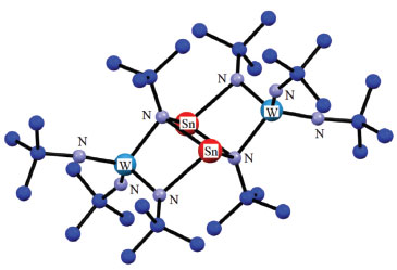 ![]() Figura 2. Estrutura molecular do [Sn{m-(NBut)2W(NBut)2}2]. A figura foi produzida utilizando-se os arquivos CIFs obtidos do CCDC (https://www. ccdc.cam.ac.uk/) cuja licença é mantida pela CAPES