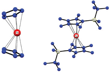 ![]() Figura 3. Estrutura molecular do [Sn(η5-C5H5)2] e do [Sn(η5-Cp5)2]. ]. A figura foi produzida utilizando-se os arquivos CIFs obtidos do CCDC (https://www.ccdc.cam.ac.uk/) cuja licença é mantida pela CAPES