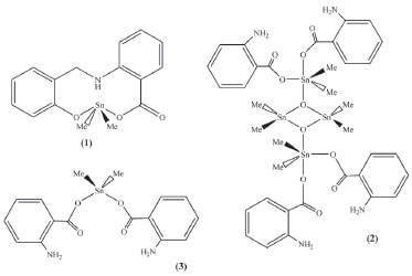 ![]() Figura 5. Estrutura dos complexos [N-(2-carboxifenil)salicilideneiminato] dimetilestanho(IV), (1), bis(μ3-O-aminobenzoato-O,O´)bis(O-aminobenzoato) tetrakis[dimetilestanho(IV)], (2) e bis(O-aminobenzoato-O,O´)di-n- -butilestanho(IV), (3)