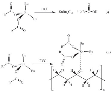 Já no final da década de 1940 a Firestone desenvolveu tiolatos organoestânicos SnR2(SR`)2 que possuem alta compatibilidade com o PVC, mas, devido ao cheiro característico, esses compostos restringiram a variedade de aplicações desse tipo de PVC, não sendo utilizado, por exemplo, em embalagens de alimentos e fármacos.84 De forma geral os compostos mais utilizados como estabilizantes são os do tipo SnR2X2 {R = Me, Bu, Oc, etc; X = carboxilatos, tiolatos, etc}. A adição de compostos organoestânicos, ou de outros cátions metálicos tem como objetivo impedir a ação do HCl no primeiro estágio da degradação. Ao entrar em contato com o HCl ocorrerá a formação do haleto correspondente, evitando a evolução desse processo que poderá afetar o desempenho eficaz e funcional do polímero. São vários os mecanismos pelos quais os carboxilatos organoestânicos estabilizam o PVC. Eles podem por exemplo, sequestrar o HCl(g) levando à formação do haleto organoestânico e do ácido carboxílico correspondente, Figura 9.