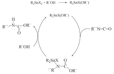 Compostos diorganoestânicos são normalmente utilizados como catalisadores nessa reação. Alguns mecanismos são propostos para descrever sua atuação catalítica, segue abaixo um deles, Figura 11.