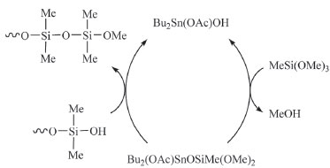 ![]() Figura 13. Mecanismo de ação do dilaurato de dibutilestanho na vulcanização do polidimetilsiloxano