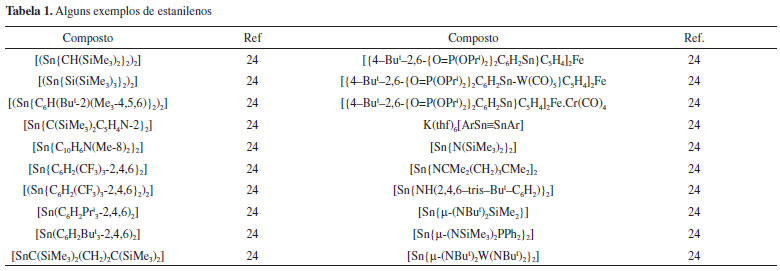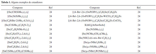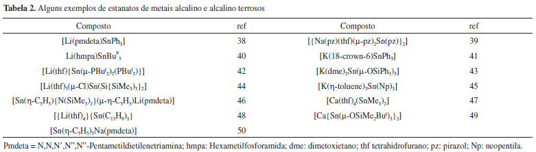 Estanocenos podem gerar outras espécies químicas, abrindo um horizonte vasto de possibilidades de reações subsequentes, por exemplo [Sn(h5-Cp)Cl], [Sn(h5-Cp)BF4] e [Sn(h5-Cp)OSO2CF3], ou compostos análogos com diferentes anéis Cp, que são geralmente obtidos ao se reagir um estanoceno com HCl, HBF4 ou HOSO2CF3. Reação subsequente do derivado Sn(h5-CpS)Cl com SnCl2 em thf levou à formação de uma espécie poli-iônica de formulação [Sn9(h5-CpS)6Cl12].36,37 Estanatos metálicos Durante muitos anos estanatos de metais alcalinos ou alcalino terrosos foram considerados espécies fugazes, geradas apenas in situ, como fonte de ânions -SnR3. Espécies químicas desse tipo são bastante conhecidas por formarem diversas ligações do tipo Sn-M ou Sn-C. Em décadas passadas surgiu um grande interesse no isolamento desses ânions principalmente para se estabelecer o grau de covalência da ligação entre o estanho e outros metais, se essas espécies seriam descritas como MSnR3, [M+][-SnR3] ou um misto de ambas as representações. Dessa forma vários exemplos foram caracterizados por cristalografia de raios-X, Tabela 2.